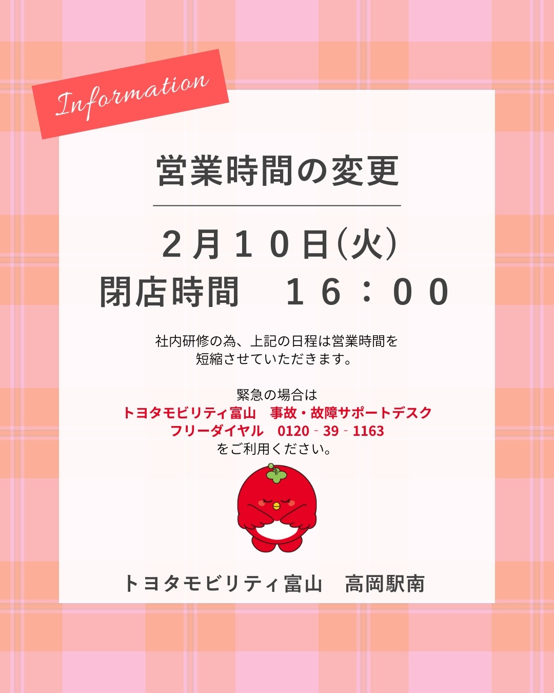2/10(火)営業時間変更のお知らせ 高岡駅南