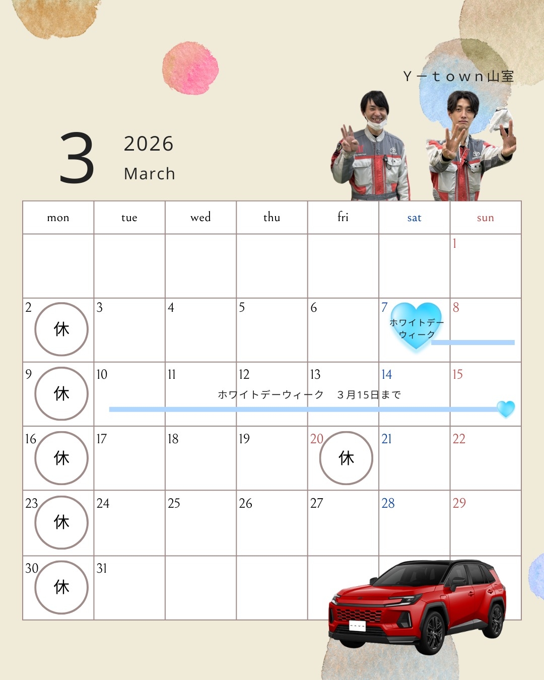 【 Y-town山室 】3月営業日カレンダーのご案内🌷