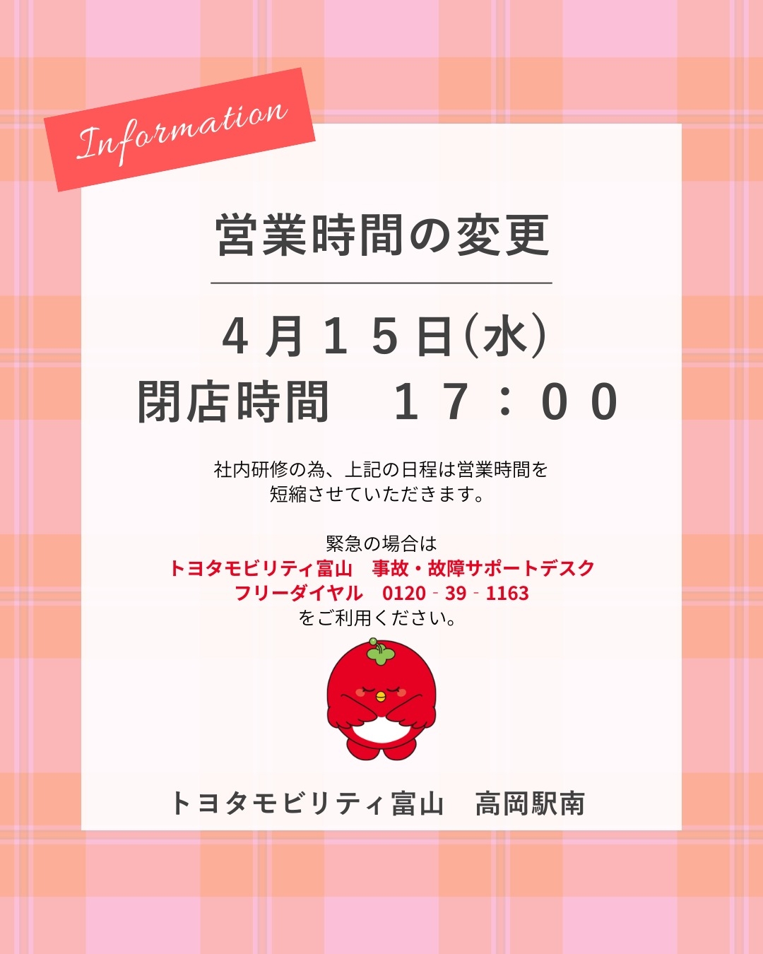 ■4/17(金)の営業時間短縮のお知らせ■ 高岡駅南