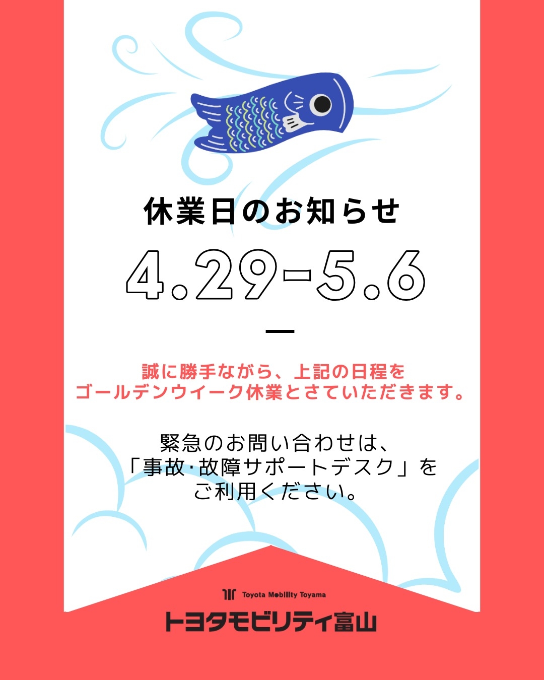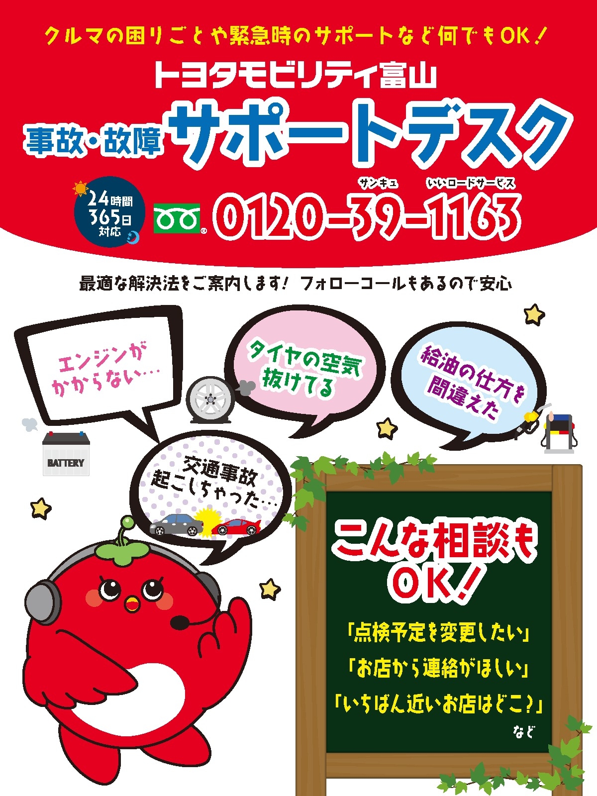休業中の事故・故障など緊急の場合は、トヨタモビリティ富山